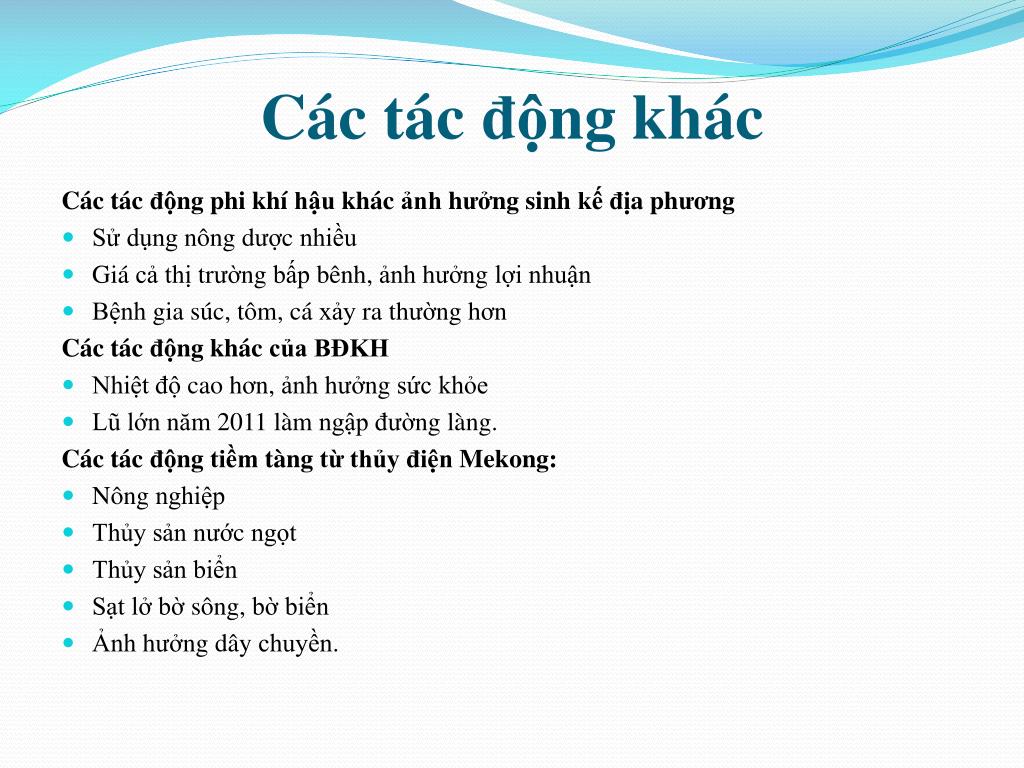 Cáctácđộngkhác Cáctácđộng phi khíhậukhácảnh hưởngsinhkếđịa phương • Sửdụngnông dược nhiều • Giácả thị trườngbấpbênh, ảnh hưởnglợinhuận • Bệnhgiasúc, tôm, cáxảyrathường hơn CáctácđộngkháccủaBĐKH • Nhiệtđộcao hơn, ảnh hưởngsứckhỏe • Lũlớn năm 2011 làmngậpđườnglàng. Cáctácđộngtiềmtàngtừthủyđiện Mekong: • Nôngnghiệp • Thủysản nước ngọt • Thủysảnbiển • Sạtlởbờsông, bờbiển • Ảnh hưởngdâychuyền.