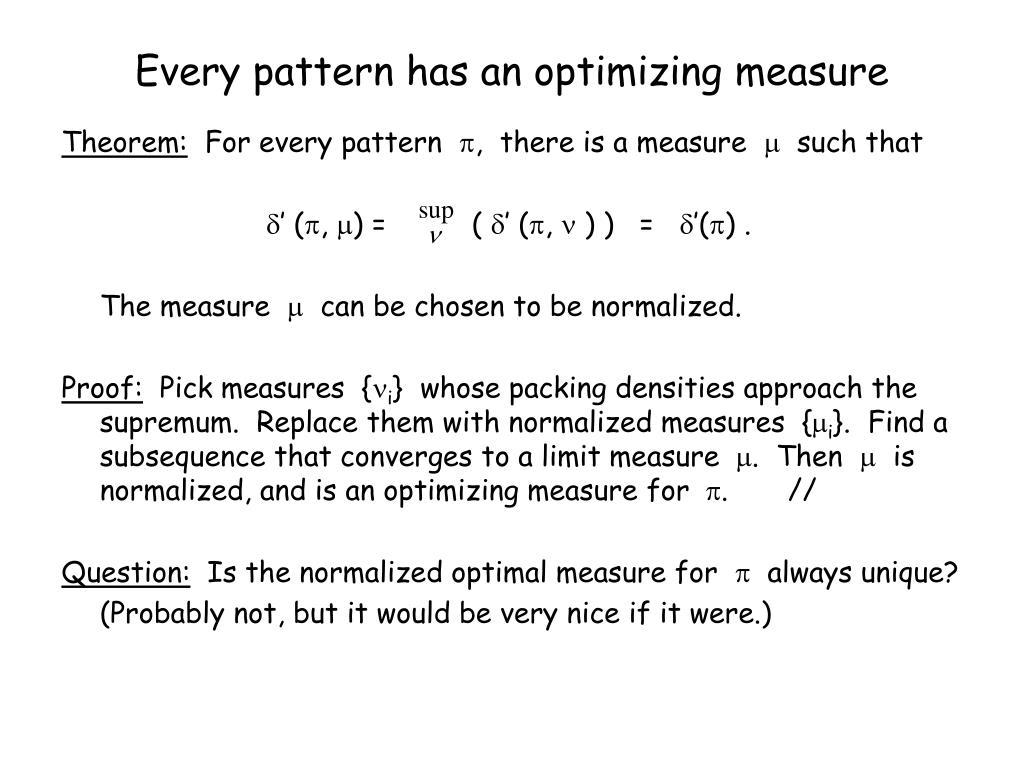Every pattern has an optimizing measure • Theorem: For every pattern , there is a measure such that • ’ (, ) = ( ’ (, ) ) = ’() . • The measure can be chosen to be normalized. • Proof: Pick measures {i} whose packing densities approach the supremum. Replace them with normalized measures {i}. Find a subsequence that converges to a limit measure . Then is normalized, and is an optimizing measure for . // • Question: Is the normalized optimal measure for always unique? • (Probably not, but it would be very nice if it were.)