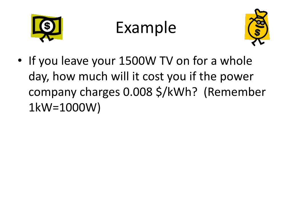 Example • If you leave your 1500W TV on for a whole day, how much will it cost you if the power company charges 0.008 $/kWh? (Remember 1kW=1000W)