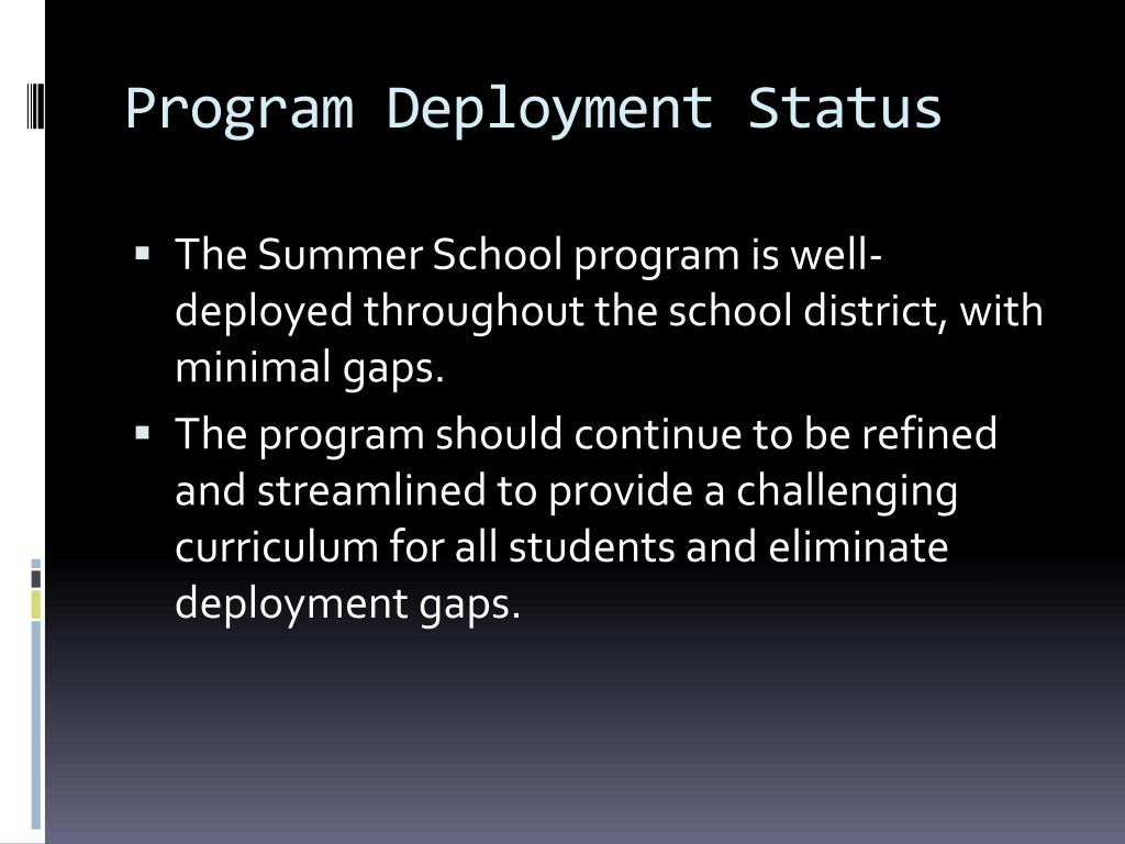 Program Deployment Status • The Summer School program is well-deployed throughout the school district, with minimal gaps. • The program should continue to be refined and streamlined to provide a challenging curriculum for all students and eliminate deployment gaps.