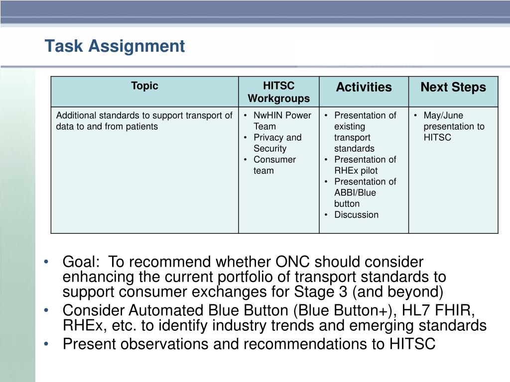 Task Assignment • Goal: To recommend whether ONC should consider enhancing the current portfolio of transport standards to support consumer exchanges for Stage 3 (and beyond) • Consider Automated Blue Button (Blue Button+), HL7 FHIR, RHEx, etc. to identify industry trends and emerging standards • Present observations and recommendations to HITSC