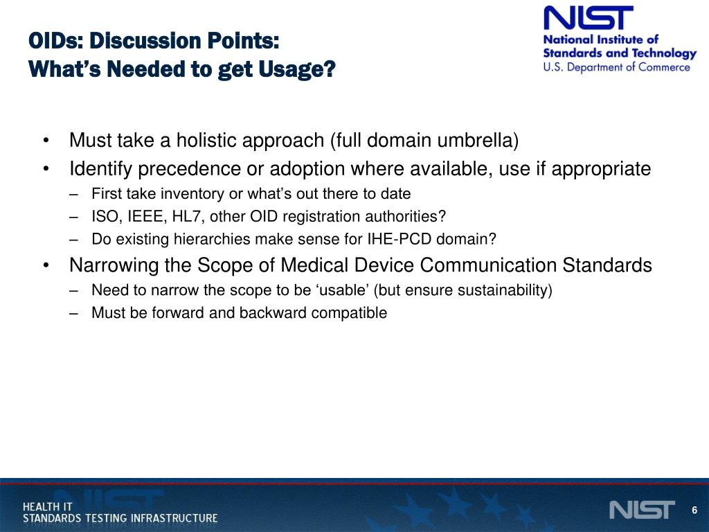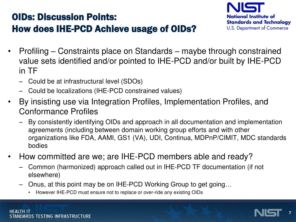 OIDs: Discussion Points:How does IHE-PCD Achieve usage of OIDs? • Profiling – Constraints place on Standards – maybe through constrained value sets identified and/or pointed to IHE-PCD and/or built by IHE-PCD in TF • Could be at infrastructural level (SDOs) • Could be localizations (IHE-PCD constrained values) • By insisting use via Integration Profiles, Implementation Profiles, and Conformance Profiles • By consistently identifying OIDs and approach in all documentation and implementation agreements (including between domain working group efforts and with other organizations like FDA, AAMI, GS1 (VA), UDI, Continua, MDPnP/CIMIT, MDC standards bodies • How committed are we; are IHE-PCD members able and ready? • Common (harmonized) approach called out in IHE-PCD TF documentation (if not elsewhere) • Onus, at this point may be on IHE-PCD Working Group to get going… • However IHE-PCD must ensure not to replace or over-ride any existing OIDs