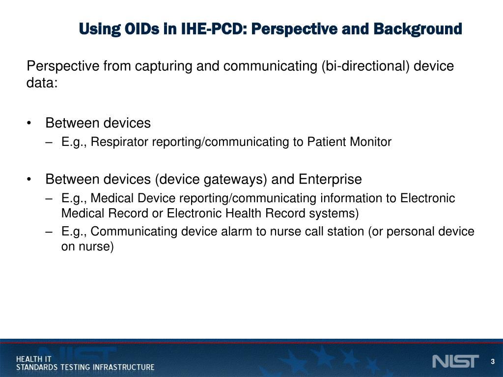 Using OIDs in IHE-PCD: Perspective and Background Perspective from capturing and communicating (bi-directional) device data: • Between devices • E.g., Respirator reporting/communicating to Patient Monitor • Between devices (device gateways) and Enterprise • E.g., Medical Device reporting/communicating information to Electronic Medical Record or Electronic Health Record systems) • E.g., Communicating device alarm to nurse call station (or personal device on nurse)