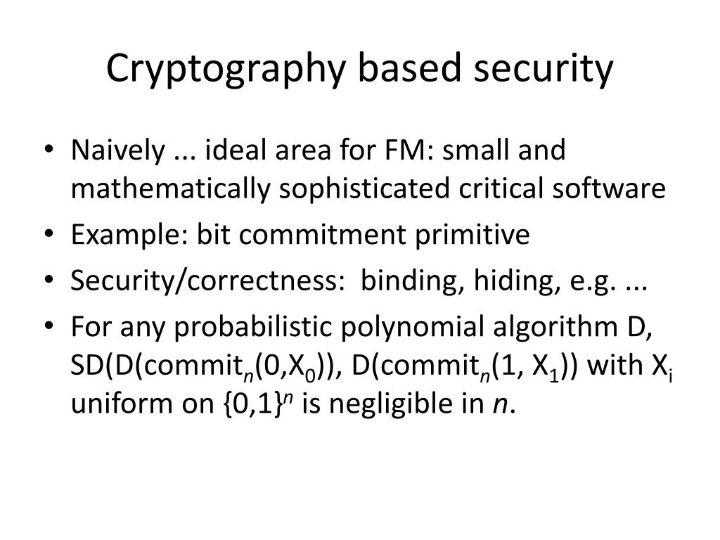 Cryptography based security • Naively ... ideal area for FM: small and mathematically sophisticated critical software • Example: bit commitment primitive • Security/correctness: binding, hiding, e.g. ... • For any probabilistic polynomial algorithm D, SD(D(commitn(0,X0)), D(commitn(1, X1)) with Xi uniform on {0,1}n is negligible in n.
