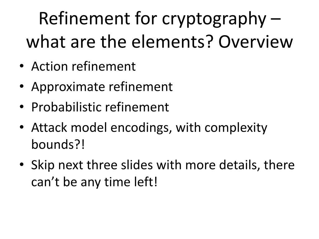 Refinement for cryptography – what are the elements? Overview • Action refinement • Approximate refinement • Probabilistic refinement • Attack model encodings, with complexity bounds?! • Skip next three slides with more details, there can’t be any time left!