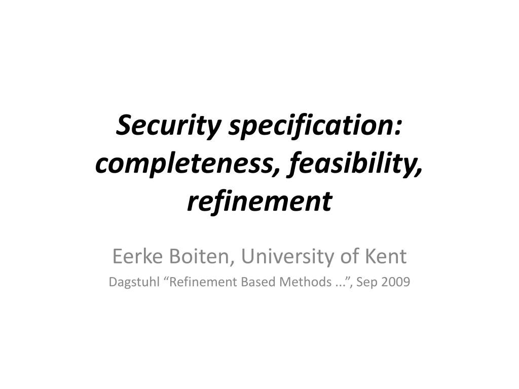 Security specification: completeness, feasibility, refinement Eerke Boiten, University of Kent Dagstuhl “Refinement Based Methods ...”, Sep 2009