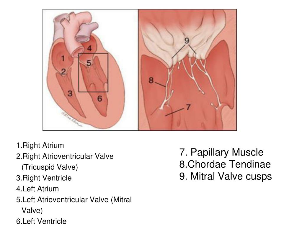 7. Papillary Muscle8.Chordae Tendinae9. Mitral Valve cusps • Right Atrium • Right Atrioventricular Valve (Tricuspid Valve) • Right Ventricle • Left Atrium • Left Atrioventricular Valve (Mitral Valve) • Left Ventricle