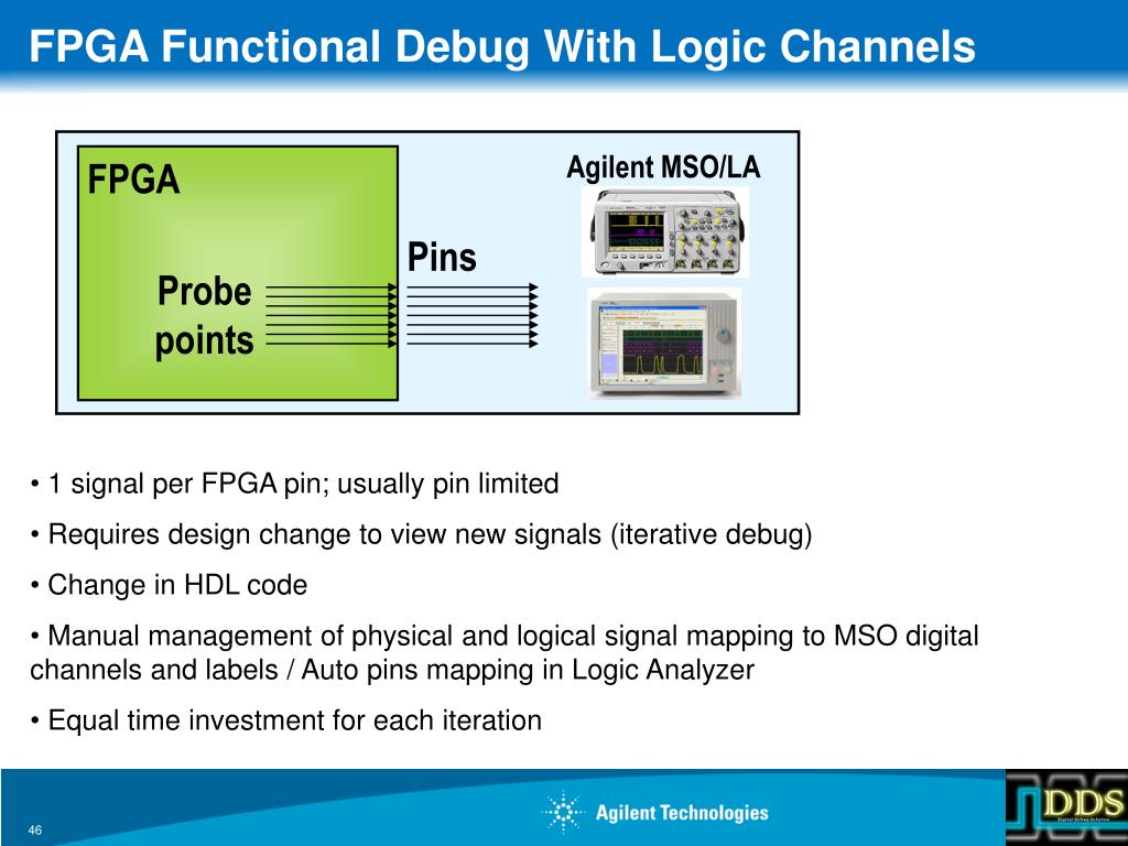 FPGA Functional Debug With Logic Channels Agilent MSO/LA FPGA Pins Probe points • 1 signal per FPGA pin; usually pin limited • Requires design change to view new signals (iterative debug) • Change in HDL code • Manual management of physical and logical signal mapping to MSO digital channels and labels / Auto pins mapping in Logic Analyzer • Equal time investment for each iteration