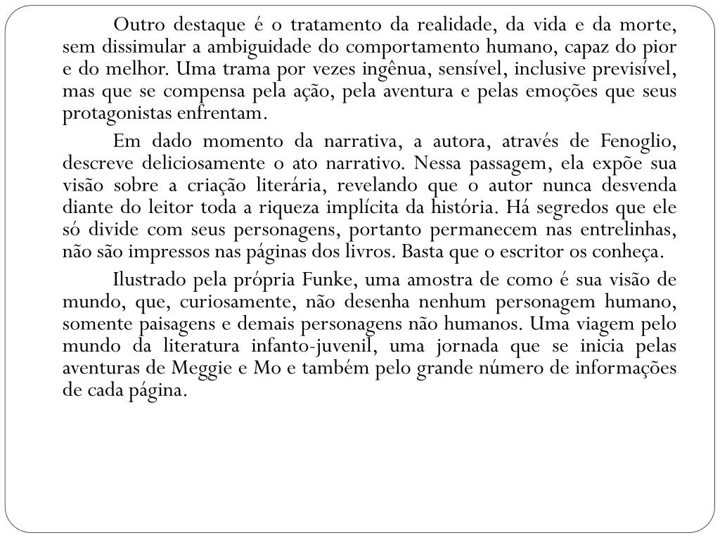 Outro destaque é o tratamento da realidade, da vida e da morte, sem dissimular a ambiguidade do comportamento humano, capaz do pior e do melhor. Uma trama por vezes ingênua, sensível, inclusive previsível, mas que se compensa pela ação, pela aventura e pelas emoções que seus protagonistas enfrentam. Em dado momento da narrativa, a autora, através de Fenoglio, descreve deliciosamente o ato narrativo. Nessa passagem, ela expõe sua visão sobre a criação literária, revelando que o autor nunca desvenda diante do leitor toda a riqueza implícita da história. Há segredos que ele só divide com seus personagens, portanto permanecem nas entrelinhas, não são impressos nas páginas dos livros. Basta que o escritor os conheça. Ilustrado pela própria Funke, uma amostra de como é sua visão de mundo, que, curiosamente, não desenha nenhum personagem humano, somente paisagens e demais personagens não humanos. Uma viagem pelo mundo da literatura infanto-juvenil, uma jornada que se inicia pelas aventuras de Meggie e Mo e também pelo grande número de informações de cada página.