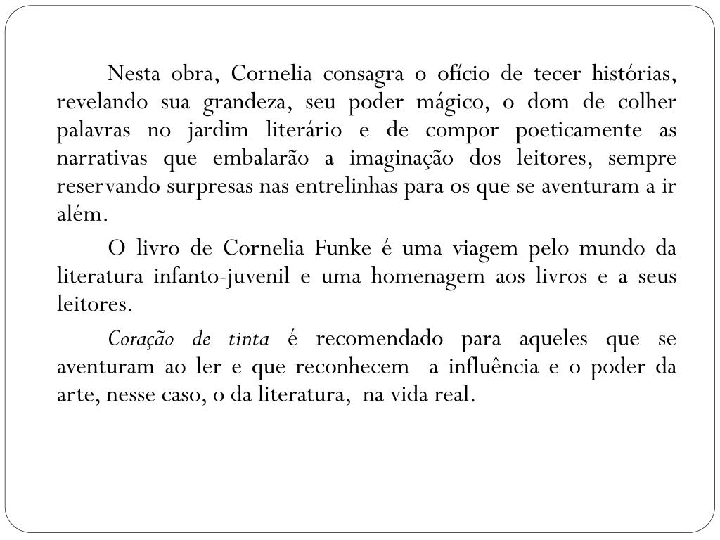 Nesta obra, Cornelia consagra o ofício de tecer histórias, revelando sua grandeza, seu poder mágico, o dom de colher palavras no jardim literário e de compor poeticamente as narrativas que embalarão a imaginação dos leitores, sempre reservando surpresas nas entrelinhas para os que se aventuram a ir além. O livro de CorneliaFunke é uma viagem pelo mundo da literatura infanto-juvenil e uma homenagem aos livros e a seus leitores. Coração de tinta é recomendado para aqueles que se aventuram ao ler e que reconhecem a influência e o poder da arte, nesse caso, o da literatura, na vida real.