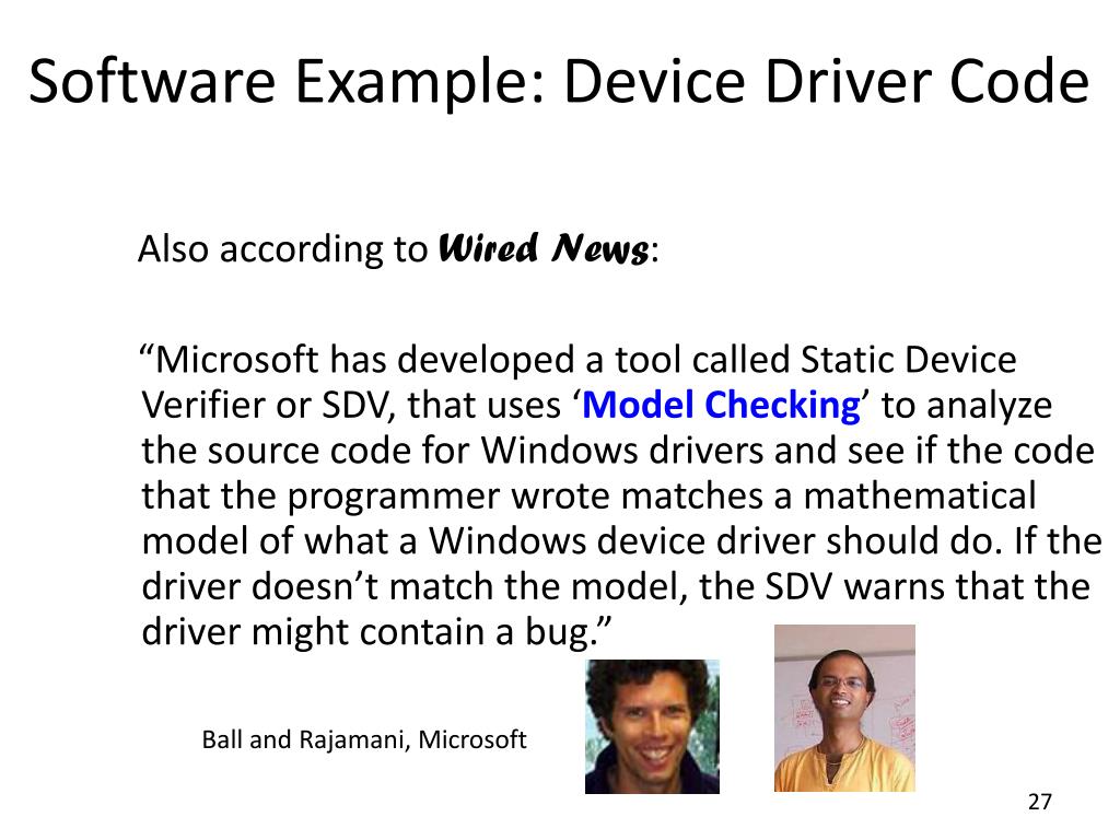 Software Example: Device Driver Code Also according to Wired News: “Microsoft has developed a tool called Static Device Verifier or SDV, that uses ‘Model Checking’ to analyze the source code for Windows drivers and see if the code that the programmer wrote matches a mathematical model of what a Windows device driver should do. If the driver doesn’t match the model, the SDV warns that the driver might contain a bug.” Ball and Rajamani, Microsoft