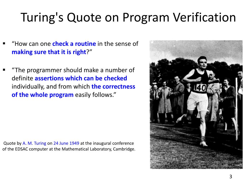 Turing's Quote on Program Verification “How can one check a routine in the sense of making sure that it is right?” “The programmer should make a number of definite assertions which can be checked individually, and from which the correctness of the whole programeasily follows.” Quote by A. M. Turing on 24 June 1949 at the inaugural conference of the EDSAC computer at the Mathematical Laboratory, Cambridge.