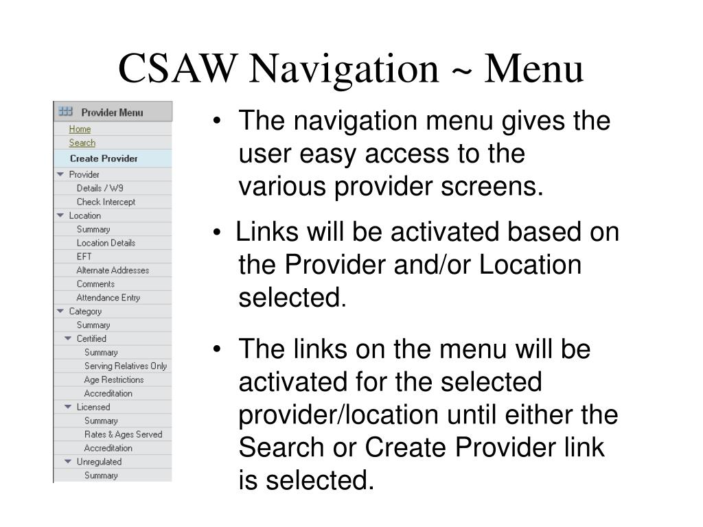 CSAW Navigation ~ Menu • The navigation menu gives the user easy access to the various provider screens. • Links will be activated based on the Provider and/or Location selected. • The links on the menu will be activated for the selected provider/location until either the Search or Create Provider link is selected.