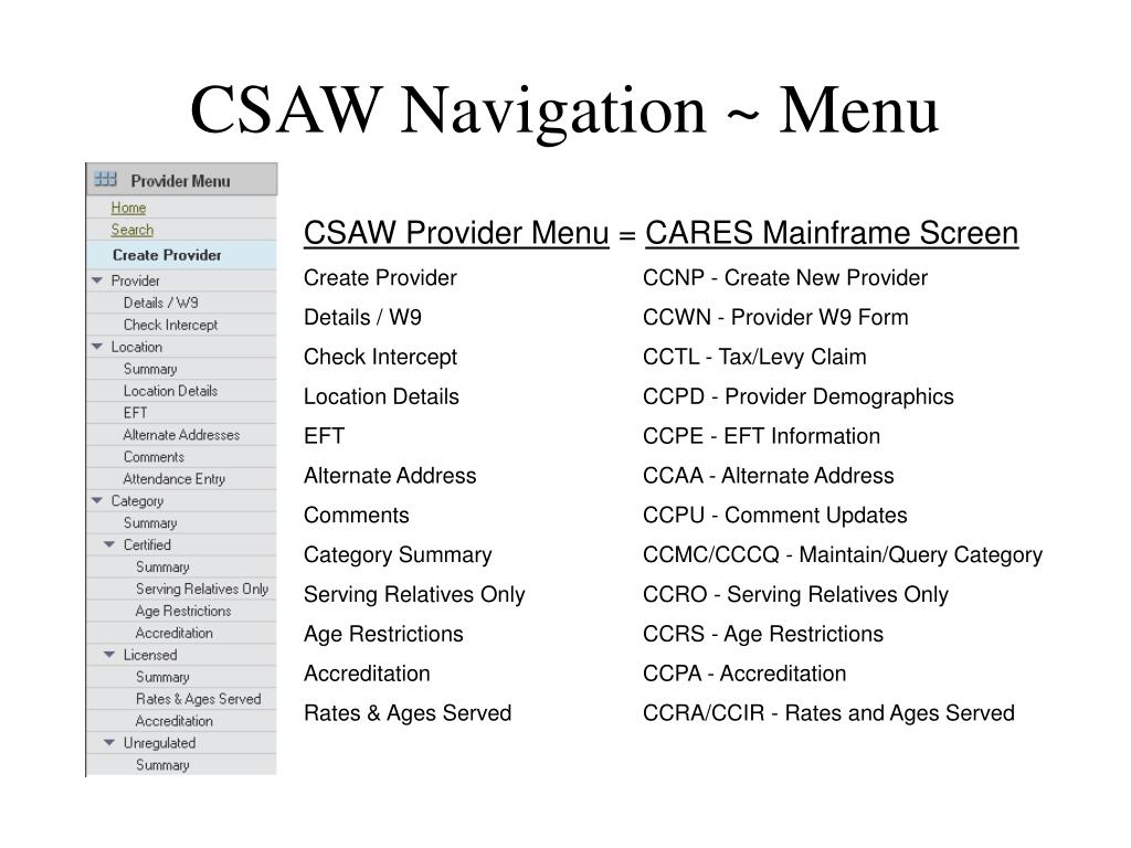 CSAW Navigation ~ Menu CSAW Provider Menu = CARES Mainframe Screen Create Provider CCNP - Create New Provider Details / W9 CCWN - Provider W9 Form Check Intercept CCTL - Tax/Levy Claim Location Details CCPD - Provider Demographics EFT CCPE - EFT Information Alternate Address CCAA - Alternate Address Comments CCPU - Comment Updates Category Summary CCMC/CCCQ - Maintain/Query Category Serving Relatives Only CCRO - Serving Relatives Only Age Restrictions CCRS - Age Restrictions Accreditation CCPA - Accreditation Rates & Ages Served CCRA/CCIR - Rates and Ages Served
