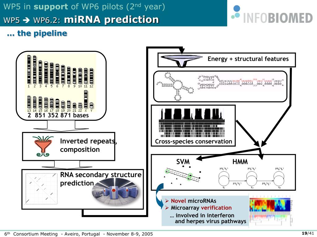 WP5 in support of WP6 pilots (2nd year) WP5 WP6.2:miRNA prediction Energy + structural features 2 851 352 871 bases Inverted repeats, composition Cross-species conservation SVM HMM RNA secondary structure prediction • Novel microRNAs • Microarray verification … involved in interferon and herpes virus pathways … the pipeline
