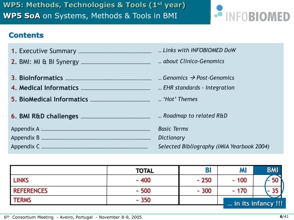TOTAL BI MI BMI LINKS ~ 400 ~ 250 ~ 100 ~ 50 REFERENCES ~ 500 ~ 300 ~ 170 ~ 35 TERMS ~ 350 WP5: Methods, Technologies & Tools (1st year) WP5 SoA on Systems, Methods & Tools in BMI Contents … in its infancy !!!