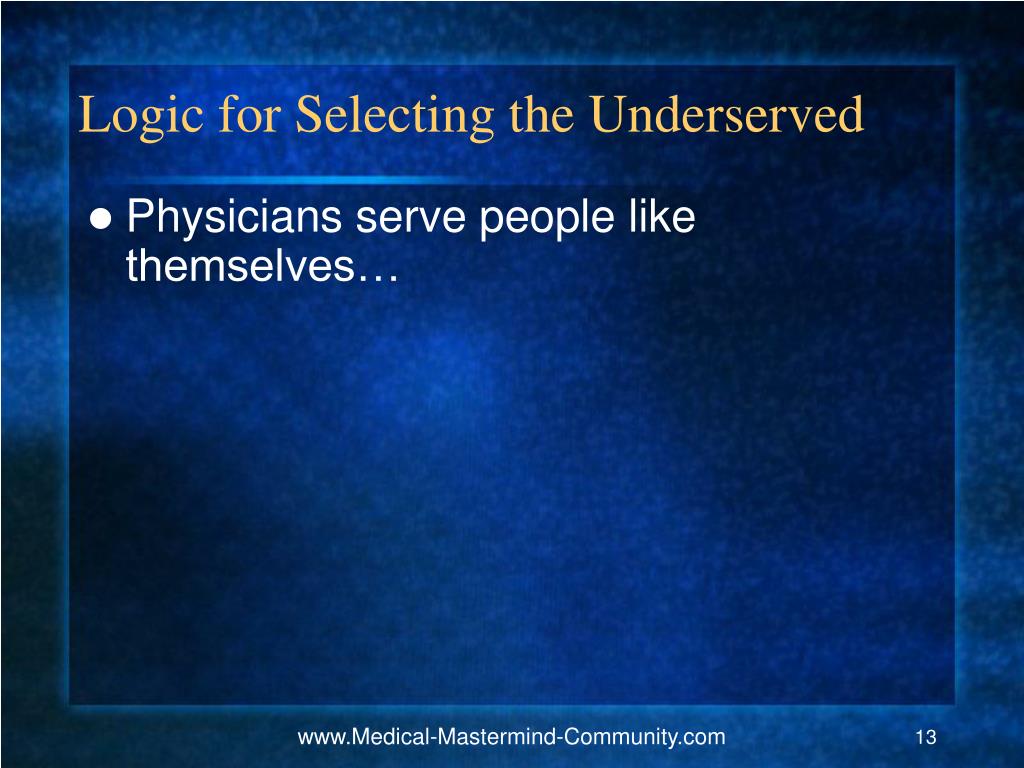 Logic for Selecting the Underserved • Physicians serve people like themselves… www.Medical-Mastermind-Community.com
