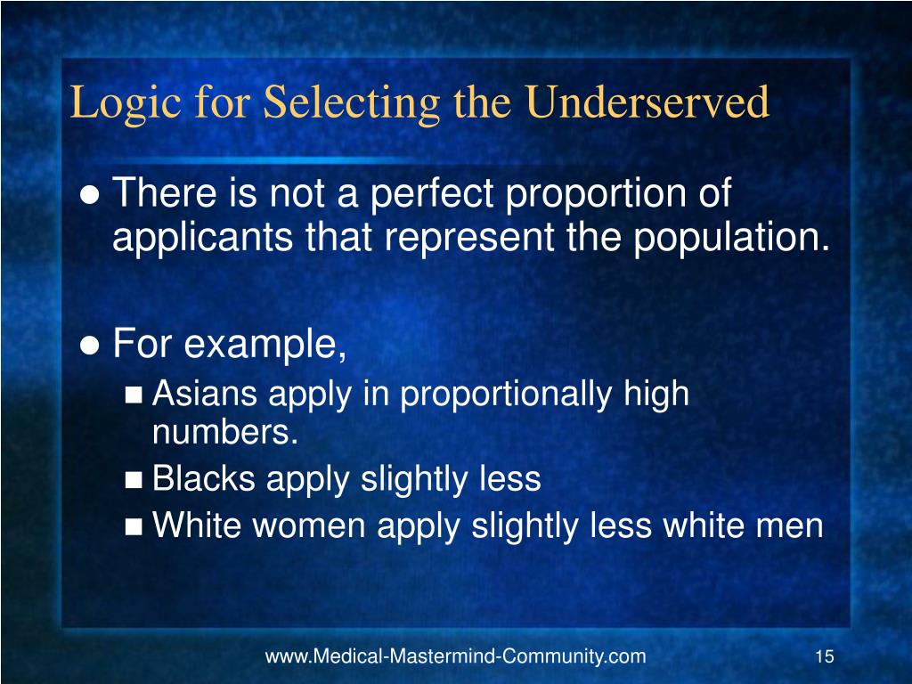 Logic for Selecting the Underserved • There is not a perfect proportion of applicants that represent the population. • For example, • Asians apply in proportionally high numbers. • Blacks apply slightly less • White women apply slightly less white men www.Medical-Mastermind-Community.com