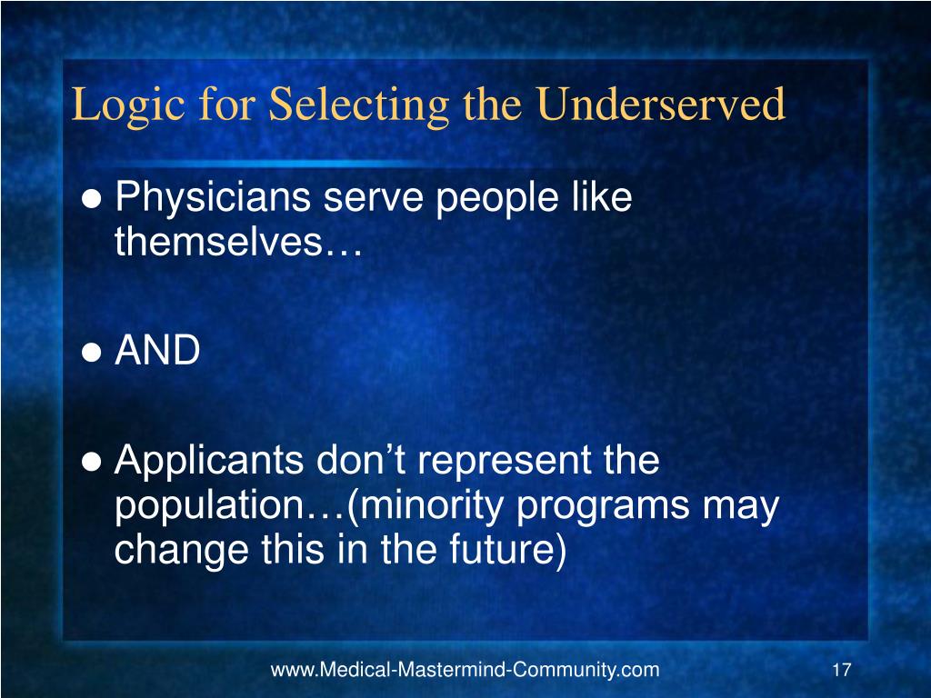Logic for Selecting the Underserved • Physicians serve people like themselves… • AND • Applicants don’t represent the population…(minority programs may change this in the future) www.Medical-Mastermind-Community.com