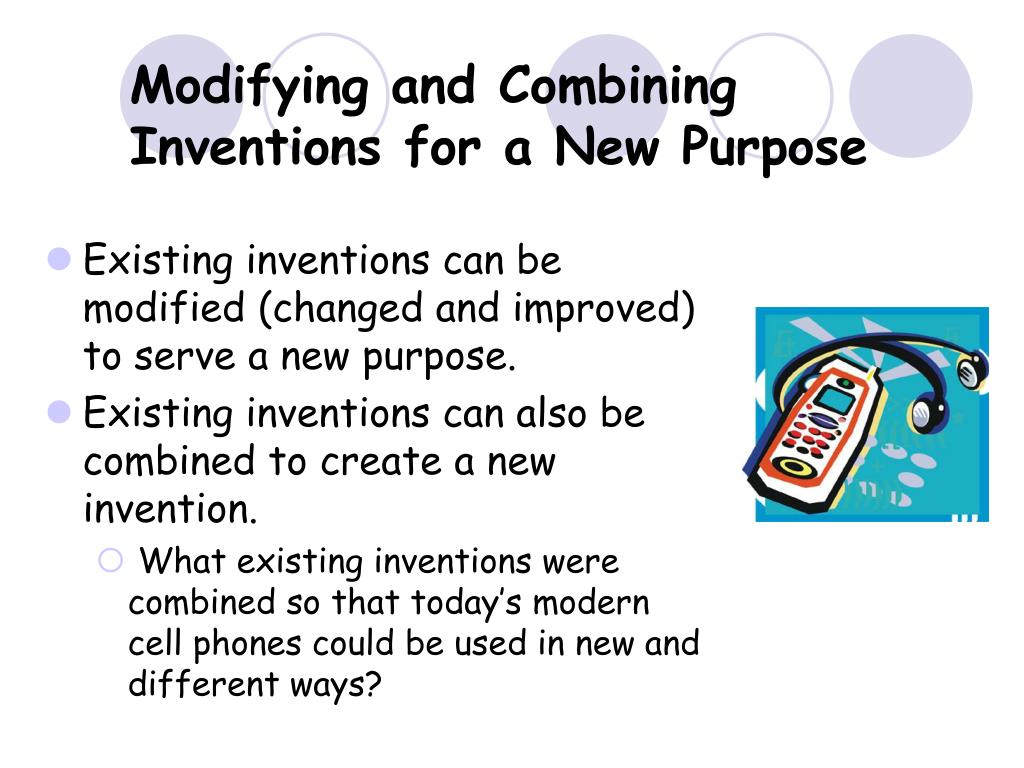 Modifying and Combining Inventions for a New Purpose • Existing inventions can be modified (changed and improved) to serve a new purpose. • Existing inventions can also be combined to create a new invention. • What existing inventions were combined so that today’s modern cell phones could be used in new and different ways?