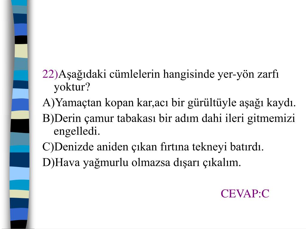 22)Aşağıdaki cümlelerin hangisinde yer-yön zarfı yoktur? A)Yamaçtan kopan kar,acı bir gürültüyle aşağı kaydı. B)Derin çamur tabakası bir adım dahi ileri gitmemizi engelledi. C)Denizde aniden çıkan fırtına tekneyi batırdı. D)Hava yağmurlu olmazsa dışarı çıkalım. CEVAP:C