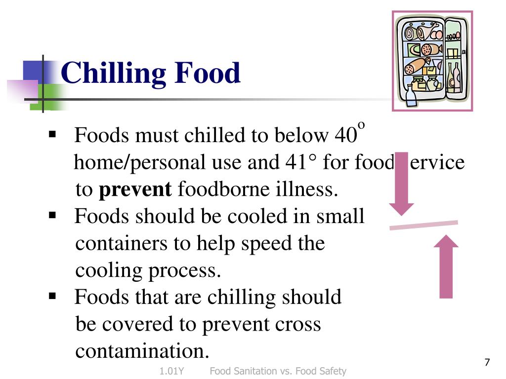 Chilling Food • Foods must chilled to below 40o home/personal use and 41° for food service to prevent foodborne illness. • Foods should be cooled in small containers to help speed the cooling process. • Foods that are chilling should be covered to prevent cross contamination. 1.01Y Food Sanitation vs. Food Safety