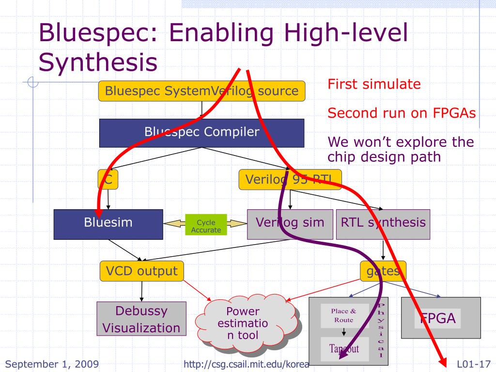 Bluespec SystemVerilog source Bluespec Compiler Verilog 95 RTL C CycleAccurate Bluesim Verilog sim RTL synthesis VCD output gates Power estimation tool Debussy Visualization FPGA Place & Route Physical Tapeout Bluespec: Enabling High-level Synthesis First simulate Second run on FPGAs We won’t explore the chip design path http://csg.csail.mit.edu/korea