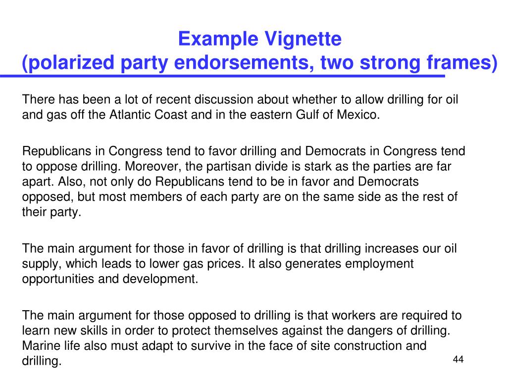 Example Vignette (polarized party endorsements, two strong frames) There has been a lot of recent discussion about whether to allow drilling for oil and gas off the Atlantic Coast and in the eastern Gulf of Mexico. Republicans in Congress tend to favor drilling and Democrats in Congress tend to oppose drilling. Moreover, the partisan divide is stark as the parties are far apart. Also, not only do Republicans tend to be in favor and Democrats opposed, but most members of each party are on the same side as the rest of their party. The main argument for those in favor of drilling is that drilling increases our oil supply, which leads to lower gas prices. It also generates employment opportunities and development. The main argument for those opposed to drilling is that workers are required to learn new skills in order to protect themselves against the dangers of drilling. Marine life also must adapt to survive in the face of site construction and drilling.