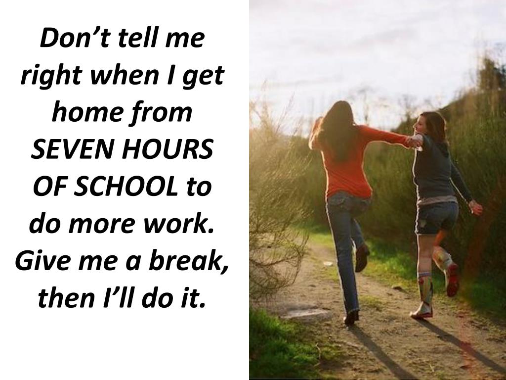 Don’t tell me right when I get home from SEVEN HOURS OF SCHOOL to do more work. Give me a break, then I’ll do it.