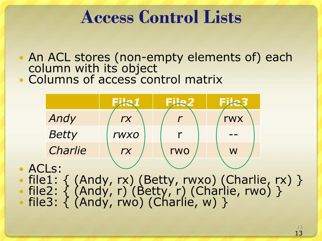 Access Control Lists • An ACL stores (non-empty elements of) each column with its object • Columns of access control matrix • ACLs: • file1: { (Andy, rx) (Betty, rwxo) (Charlie, rx) } • file2: { (Andy, r) (Betty, r) (Charlie, rwo) } • file3: { (Andy, rwo) (Charlie, w) } 13