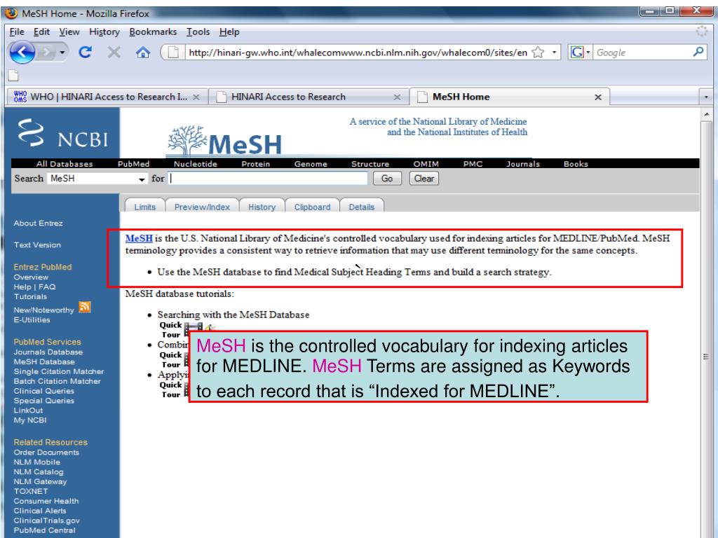 Table of Contents • Using MeSH in PubMed • The MeSH database • Major Topic Headings and Explode • Using MeSH terms • Geographic regions