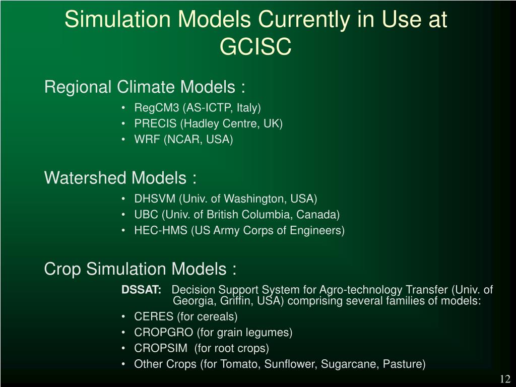 Simulation Models Currently in Use at GCISC Regional Climate Models : • RegCM3 (AS-ICTP, Italy) • PRECIS (Hadley Centre, UK) • WRF (NCAR, USA) Watershed Models : • DHSVM (Univ. of Washington, USA) • UBC (Univ. of British Columbia, Canada) • HEC-HMS (US Army Corps of Engineers) Crop Simulation Models : DSSAT: Decision Support System for Agro-technology Transfer (Univ. of Georgia, Griffin, USA) comprising several families of models: • CERES (for cereals) • CROPGRO (for grain legumes) • CROPSIM (for root crops) • Other Crops (for Tomato, Sunflower, Sugarcane, Pasture)
