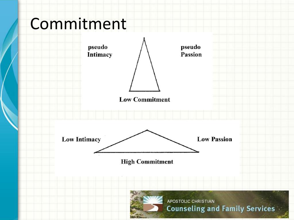 Passion This triangle shows the unbalanced shape of ‘Counterfeit Love’ which occurs in an affair. High levels of ‘pseudo-intimacy’ coupled with a high level of ‘pseudo-passion’ over little or no commitment Prov 5: 20-23 - And why wilt thou, my son, be ravished with a strange woman, and embrace the bosom of a stranger? For the ways of man are before the eyes of the LORD, and he pondereth all his goings. His own iniquities shall take the wicked himself, and he shall be holden with the cords of his sins. He shall die without instruction; and in the greatness of his folly he shall go astray.