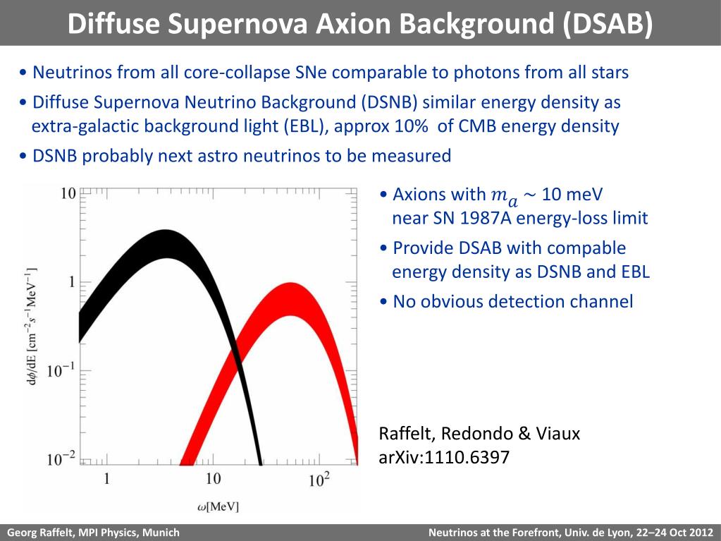 Diffuse Supernova Axion Background (DSAB) • Neutrinos from all core-collapse SNe comparable to photons from all stars • Diffuse Supernova Neutrino Background (DSNB) similar energy density as • extra-galactic background light (EBL), approx 10% of CMB energy density • DSNB probably next astro neutrinos to be measured • Axions with • near SN 1987A energy-loss limit • Provide DSAB with compable • energy density as DSNB and EBL • No obvious detection channel Raffelt, Redondo & Viaux arXiv:1110.6397