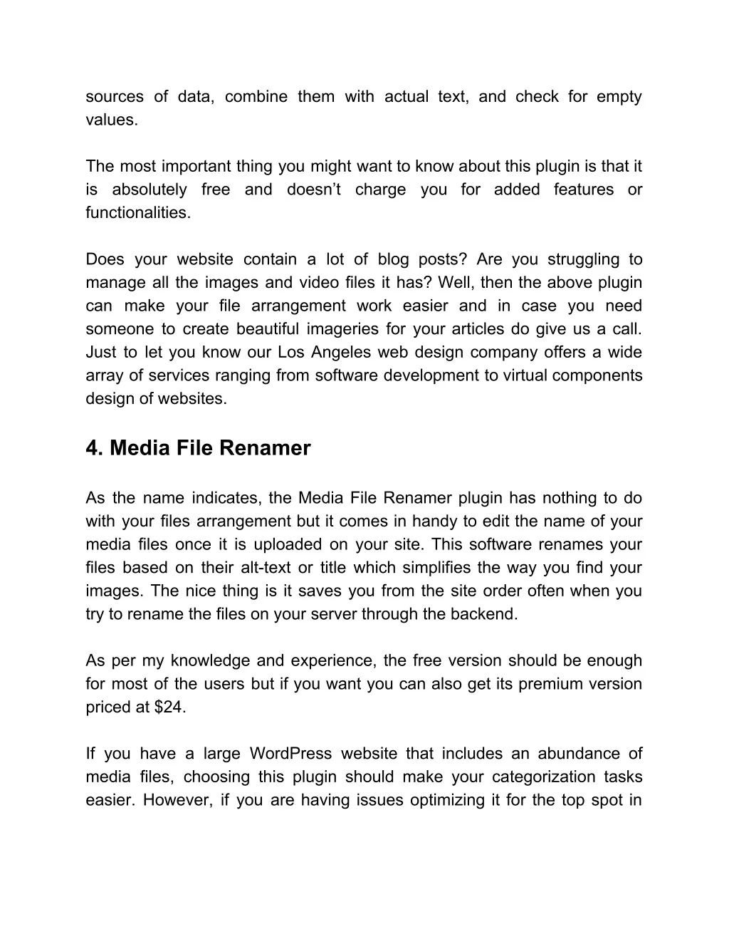sources of data, combine them with actual text, and check for empty values. The most important thing you might want to know about this plugin is that it is absolutely free and doesn’t charge you for added features or functionalities. Does your website contain a lot of blog posts? Are you struggling to manage all the images and video files it has? Well, then the above plugin can make your file arrangement work easier and in case you need someone to create beautiful imageries for your articles do give us a call. Just to let you know our Los Angeles web design company offers a wide array of services ranging from software development to virtual components design of websites. 4. Media File Renamer As the name indicates, the Media File Renamer plugin has nothing to do with your files arrangement but it comes in handy to edit the name of your media files once it is uploaded on your site. This software renames your files based on their alt-text or title which simplifies the way you find your images. The nice thing is it saves you from the site order often when you try to rename the files on your server through the backend. As per my knowledge and experience, the free version should be enough for most of the users but if you want you can also get its premium version priced at $24. If you have a large WordPress website that includes an abundance of media files, choosing this plugin should make your categorization tasks easier. However, if you are having issues optimizing it for the top spot in