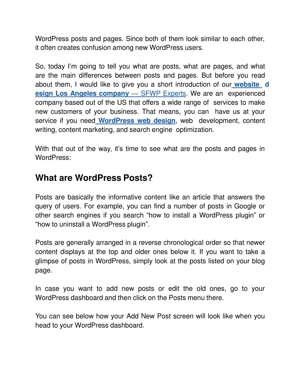 WordPress posts and pages. Since both of them look similar to each other, it often creates confusion among new WordPressusers. So, today I’m going to tell you what are posts, what are pages, and what are the main differences between posts and pages. But before you read about them, I would like to give you a short introduction of ourwebsite design Los Angeles company — SFWP Experts. We are an experienced company based out of the US that offers a wide range of services to make new customers of your business. That means, you can have us at your service if you needWordPress web design, web development, content writing, content marketing, and search engine optimization. With that out of the way, it’s time to see what are the posts and pages in WordPress: What are WordPressPosts? Posts are basically the informative content like an article that answers the query of users. For example, you can find a number of posts in Google or other search engines if you search “how to install a WordPress plugin” or “how to uninstall a WordPressplugin”. Posts are generally arranged in a reverse chronological order so that newer content displays at the top and older ones below it. If you want to take a glimpse of posts in WordPress, simply look at the posts listed on your blog page. In case you want to add new posts or edit the old ones, go to your WordPress dashboard and then click on the Posts menuthere. You can see below how your Add New Post screen will look like when you head to your WordPressdashboard.