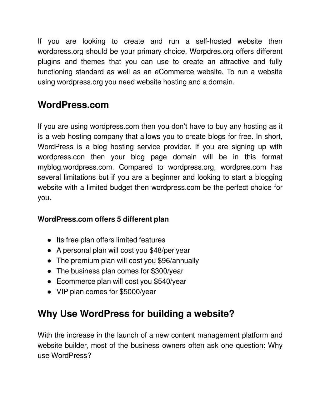 If you are looking to create and run a self-hosted website then wordpress.org should be your primary choice. Worpdres.org offers different plugins and themes that you can use to create an attractive and fully functioning standard as well as an eCommerce website. To run a website using wordpress.org you need website hosting and adomain. • WordPress.com • If you are using wordpress.com then you don’t have to buy any hosting as it is a web hosting company that allows you to create blogs for free. In short, WordPress is a blog hosting service provider. If you are signing up with wordpress.con then your blog page domain will be in this format myblog.wordpress.com. Compared to wordpress.org, wordpres.com has several limitations but if you are a beginner and looking to start a blogging website with a limited budget then wordpress.com be the perfect choice for you. • WordPress.com offers 5 differentplan • Its free plan offers limitedfeatures • A personal plan will cost you $48/peryear • The premium plan will cost you$96/annually • The business plan comes for$300/year • Ecommerce plan will cost you$540/year • VIP plan comes for$5000/year • Why Use WordPress for building awebsite? • With the increase in the launch of a new content management platform and website builder, most of the business owners often ask one question: Why useWordPress?