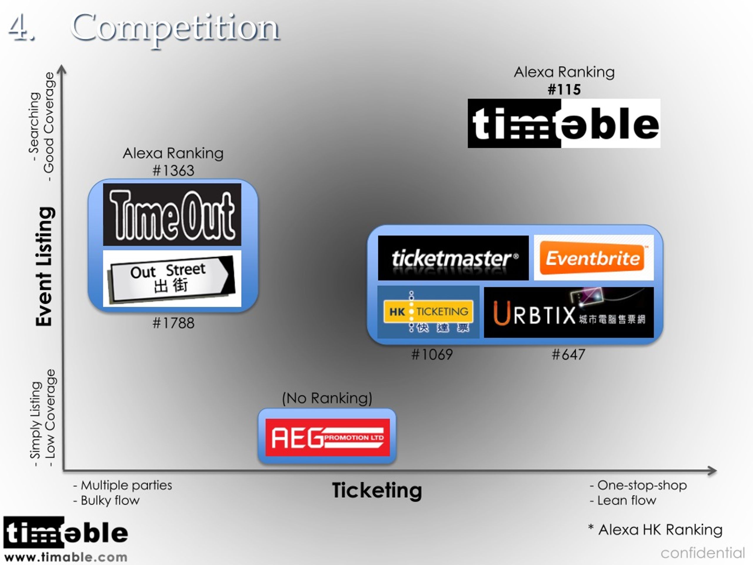 5. Competition Alexa Ranking#115 - Searching- Good Coverage Alexa Ranking#1363 Event Listing #1788 #1069 #647 (No Ranking) - Simply Listing- Low Coverage Ticketing - Multiple parties- Bulky flow - One-stop-shop- Lean flow * Alexa HK Ranking