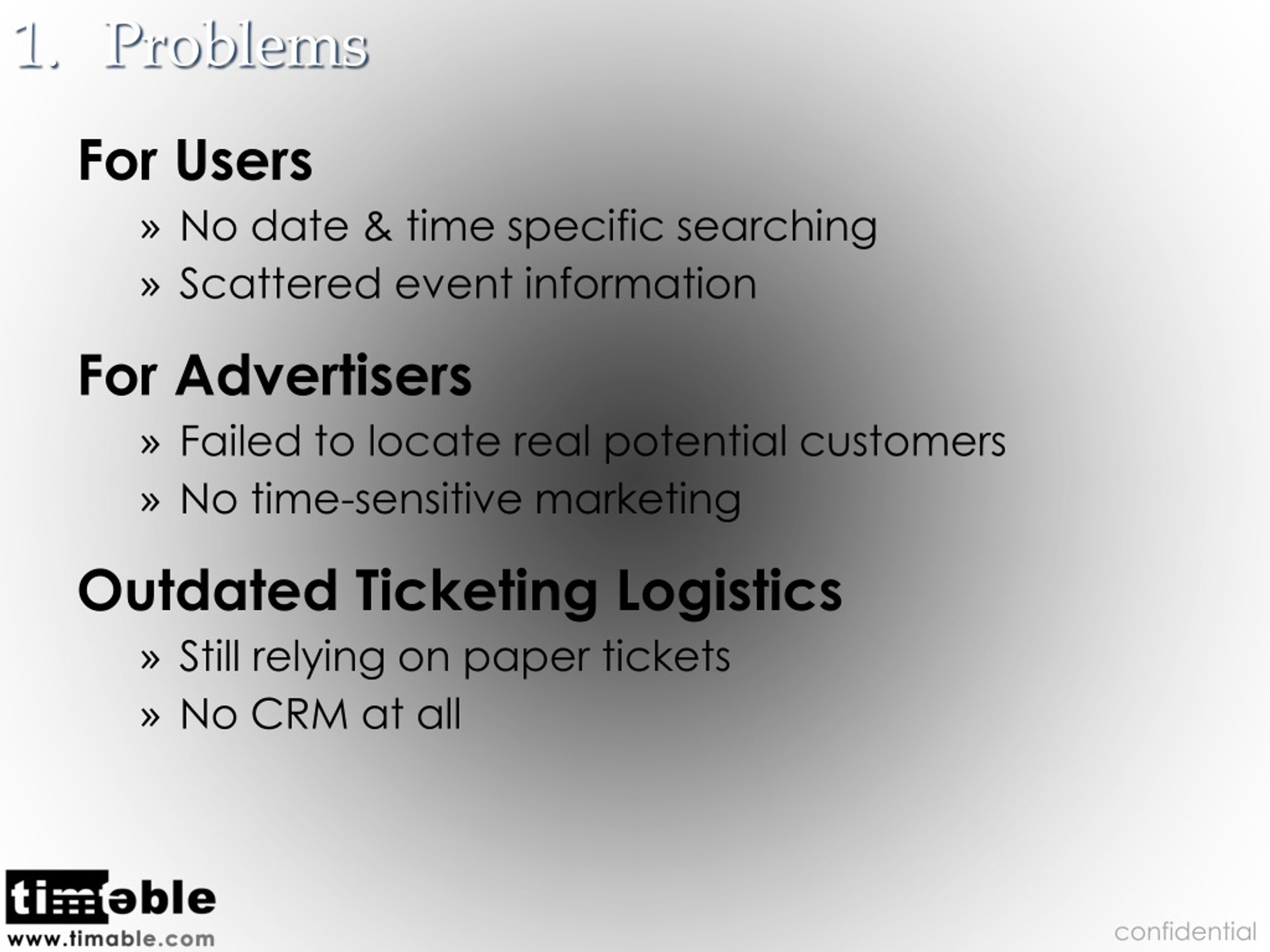 1. Problems • For Users • No date & time specific searching • Scattered event information • For Advertisers • Failed to locate real potential customers • No time-sensitive marketing • Outdated Ticketing Logistics • Still relying on paper tickets • No CRM at all