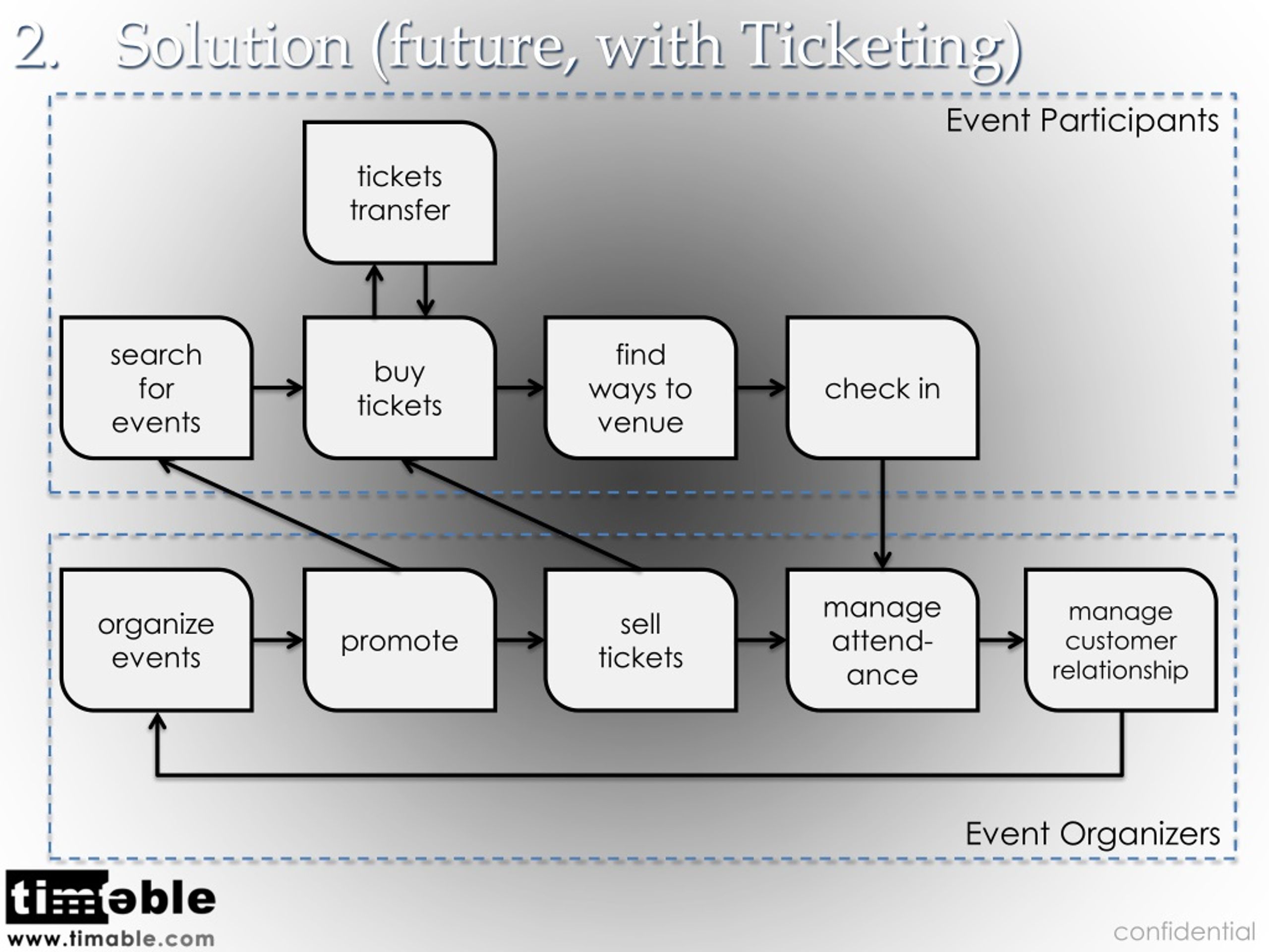 3. Solution (future, with Ticketing) • Event Participants ticketstransfer search for events buy tickets find ways to venue check in organize events promote sell tickets manage attend-ance managecustomerrelationship • Event Organizers