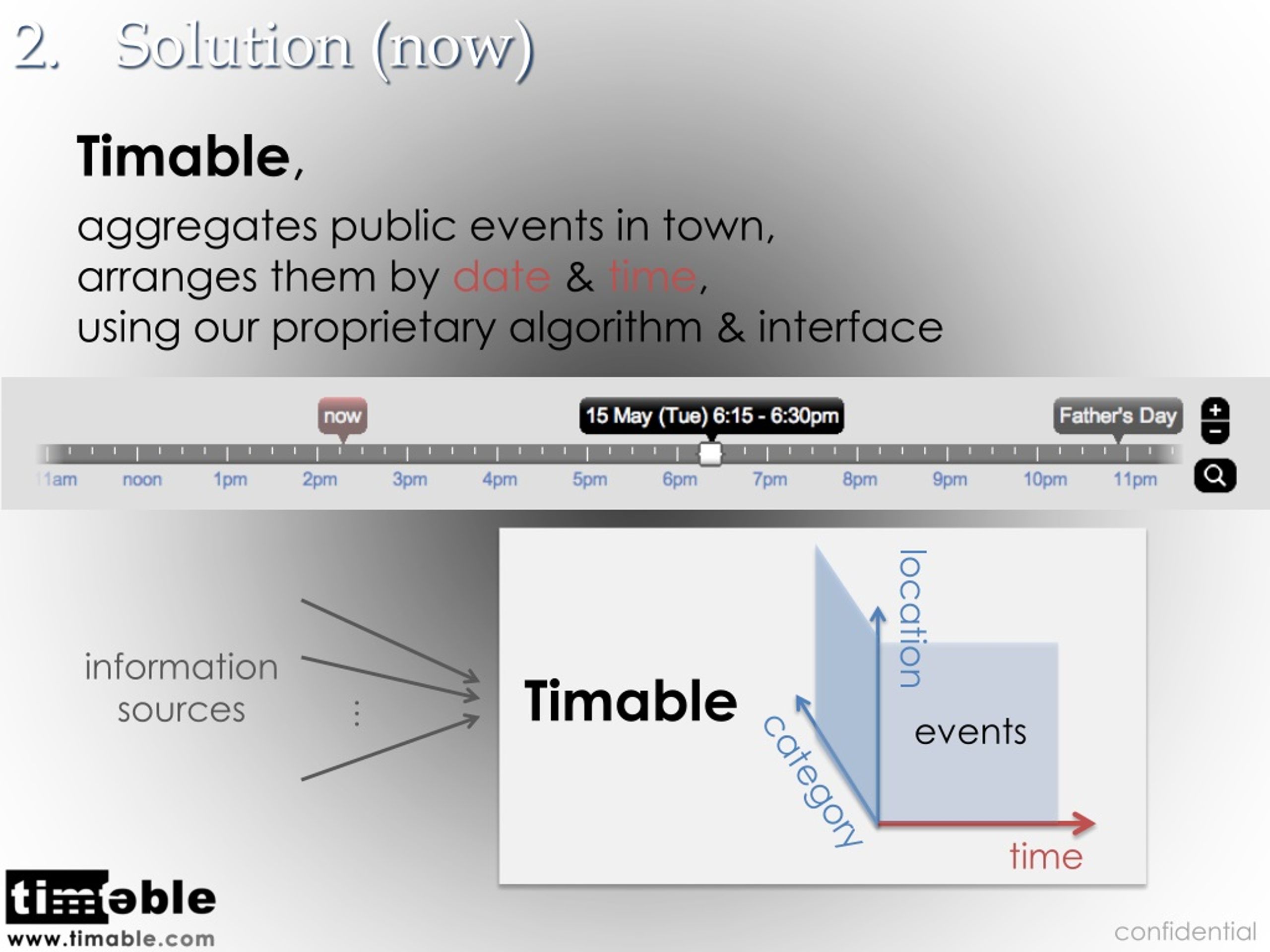 2. Solution (now) • Timable, • aggregates public events in town,arranges them by date & time,using our proprietary algorithm & interface location information sources Timable … events category time