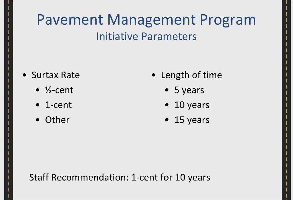 Pavement Management ProgramInitiative Parameters • Surtax Rate • ½-cent • 1-cent • Other • Length of time • 5 years • 10 years • 15 years • Staff Recommendation: 1-cent for 10 years