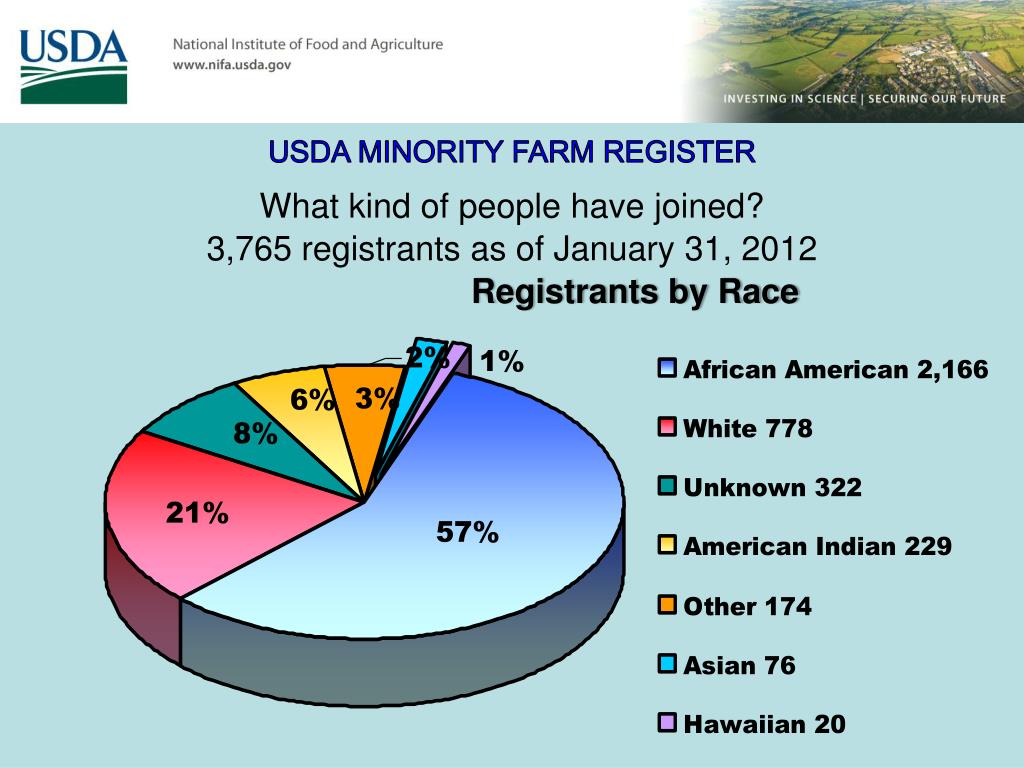 USDA MINORITY FARM REGISTER What kind of people have joined? 3,765 registrants as of January 31, 2012 Registrants by Race