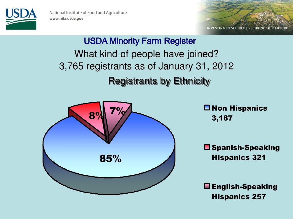 USDA Minority Farm Register What kind of people have joined? 3,765 registrants as of January 31, 2012 Registrants by Ethnicity