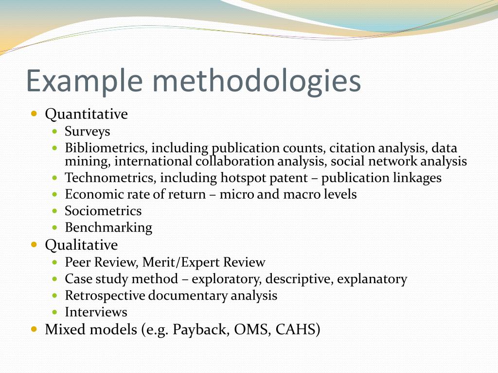 Example methodologies • Quantitative • Surveys • Bibliometrics, including publication counts, citation analysis, data mining, international collaboration analysis, social network analysis • Technometrics, including hotspot patent – publication linkages • Economic rate of return – micro and macro levels • Sociometrics • Benchmarking • Qualitative • Peer Review, Merit/Expert Review • Case study method – exploratory, descriptive, explanatory • Retrospective documentary analysis • Interviews • Mixed models (e.g. Payback, OMS, CAHS)