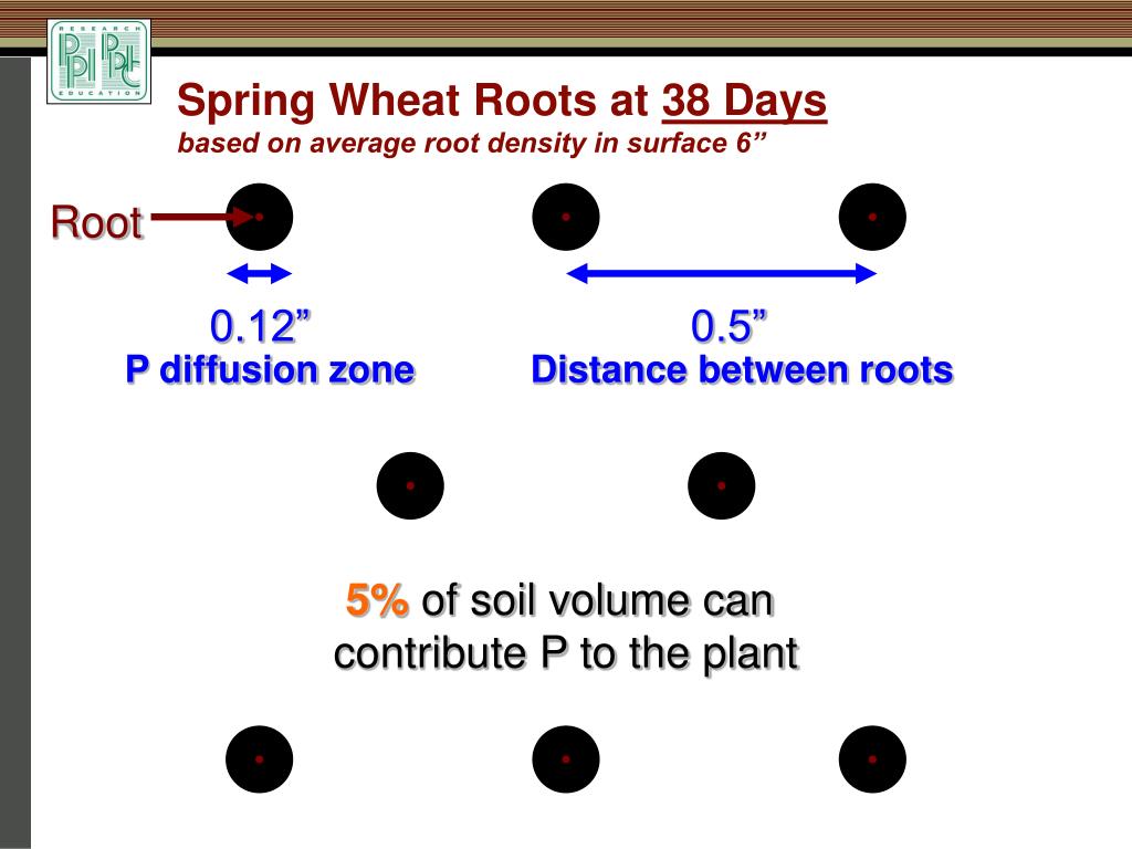Root 0.12” 0.5” P diffusion zone Distance between roots Spring Wheat Roots at 38 Daysbased on average root density in surface 6” 5% of soil volume can contribute P to the plant
