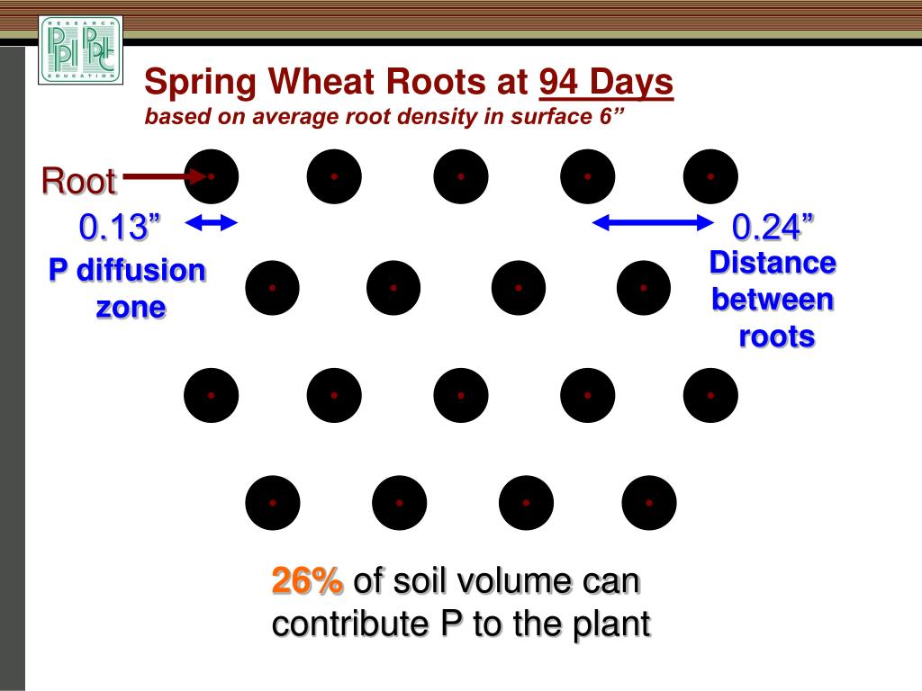 0.24” Distance between roots Spring Wheat Roots at 94 Daysbased on average root density in surface 6” Root 0.13” P diffusion zone 26% of soil volume can contribute P to the plant