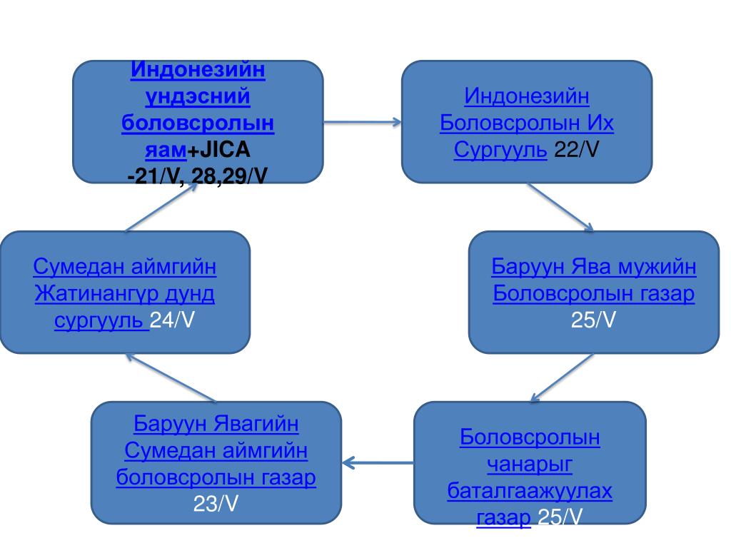 Индонезийн үндэсний боловсролын яам+JICA -21/V, 28,29/V Индонезийн Боловсролын Их Сургууль 22/V Сумедан аймгийн Жатинангүр дунд сургууль 24/V Баруун Ява мужийн Боловсролын газар 25/V Баруун Явагийн Сумедан аймгийн боловсролын газар 23/V Боловсролын чанарыг баталгаажуулах газар 25/V