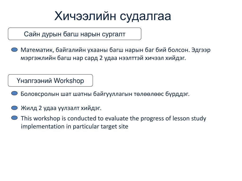 Хичээлийн судалгаа Сайн дурын багш нарын сургалт Математик, байгалийн ухааны багш нарын баг бий болсон. Эдгээр мэргэжлийн багш нар сард 2 удаа нээлттэй хичээл хийдэг. Үнэлгээний Workshop Боловсролын шат шатны байгууллагын төлөөлөөс бүрддэг. Жилд 2 удаа уулзалт хийдэг. This workshop is conducted to evaluate the progress of lesson study implementation in particular target site