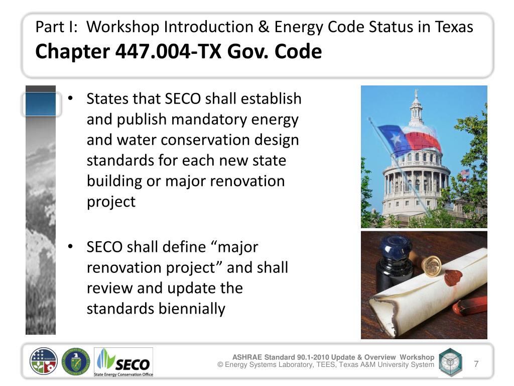 States that SECO shall establish and publish mandatory energy and water conservation design standards for each new state building or major renovation project SECO shall define “major renovation project” and shall review and update the standards biennially Part I: Workshop Introduction & Energy Code Status in Texas Chapter 447.004-TX Gov. Code